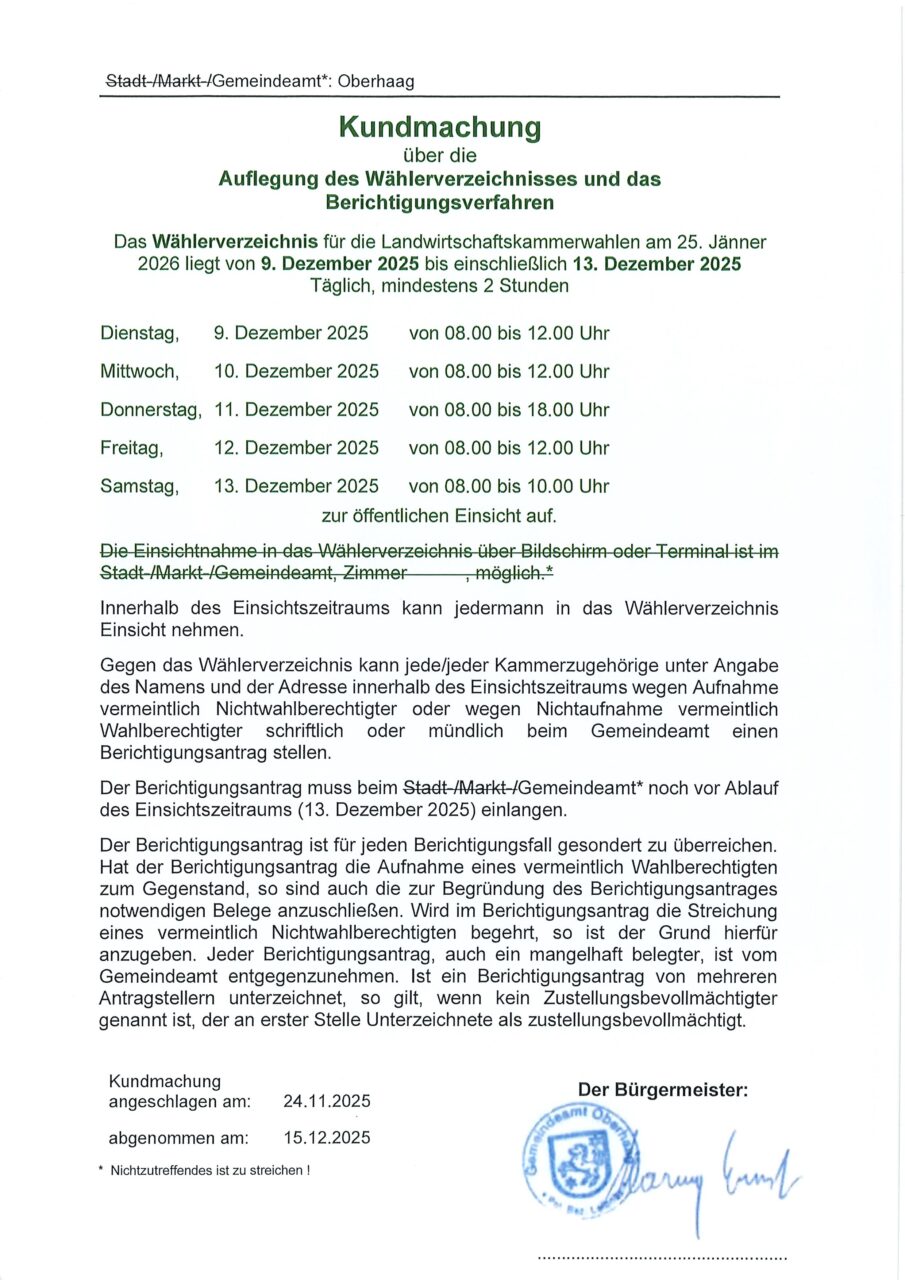 Auflegung des Wählerverzeichnisses und das Berichtigungsverfahren für die Landwirtschaftskammerwahl am 25. Jänner 2026.