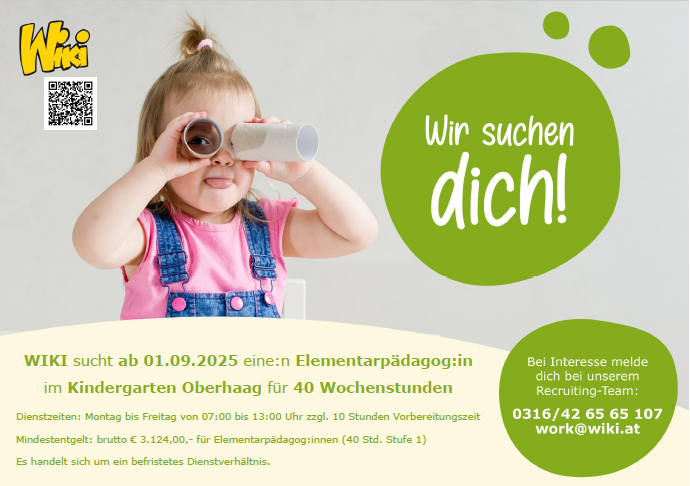 WIKI Oberhaag sucht ab 01.09.2025 eine:n Elementarpädagog:in für 40 Wochenstunden!