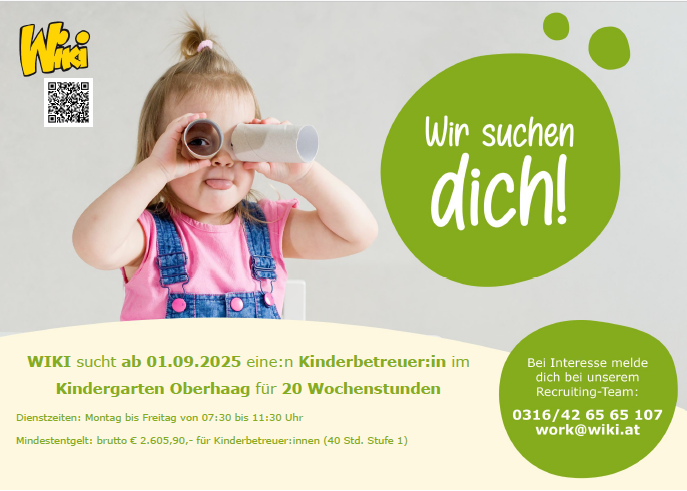 WIKI Oberhaag sucht ab 01.09.2025 eine:n Kinderbetreuer:in für 20 Wochenstunden.