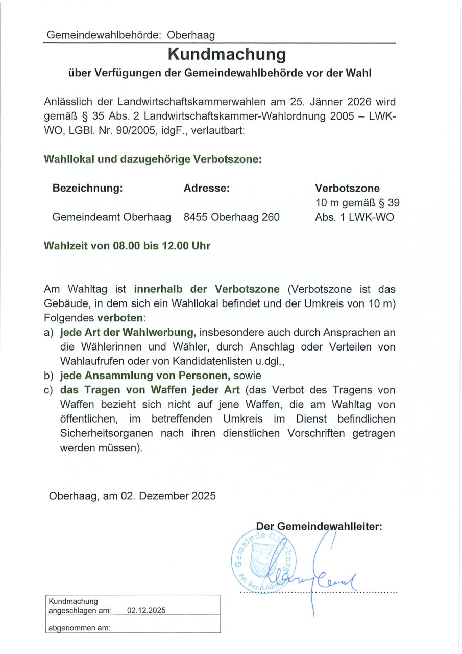 Kundmachung über Verfügung der Gemeindewahlbehörde vor der Wahl anlässlich der Landwirtschaftskammerwahl am 25. Jänner 2026.